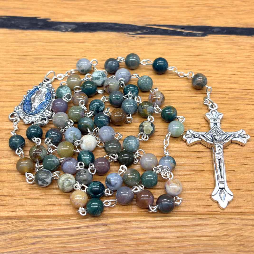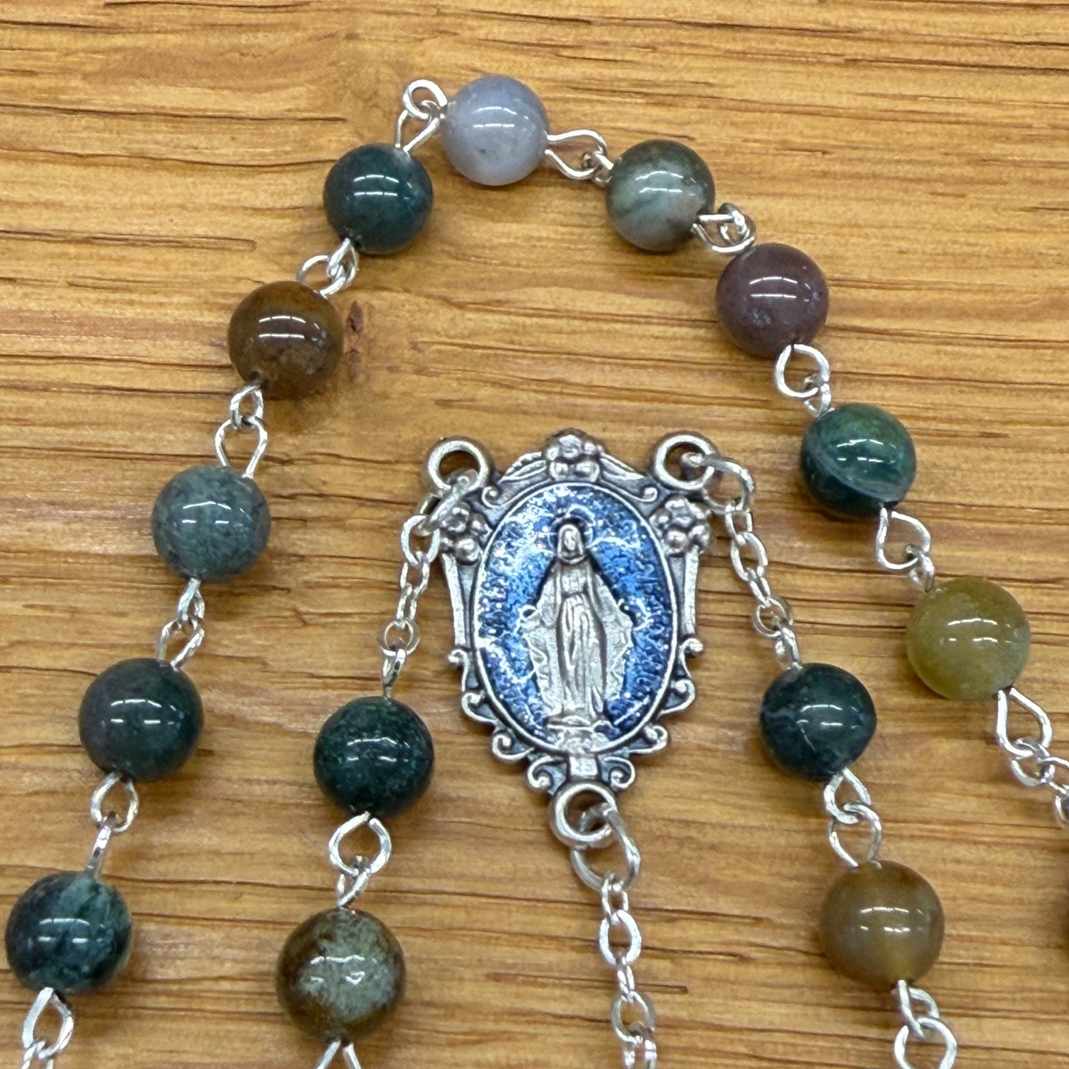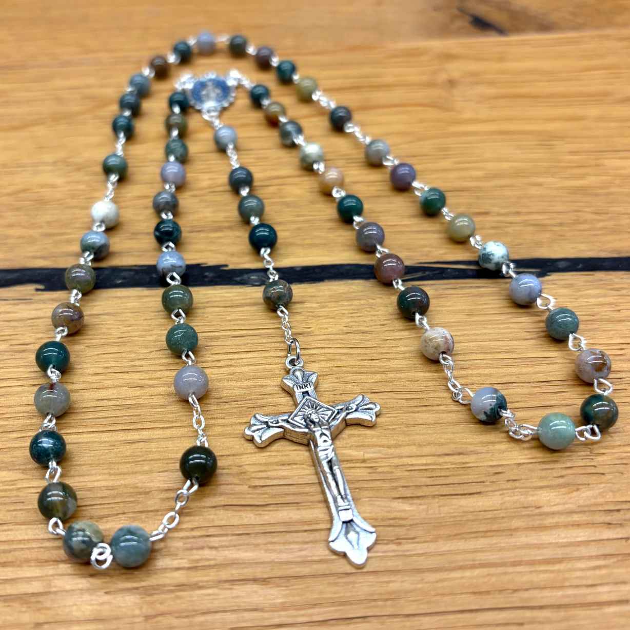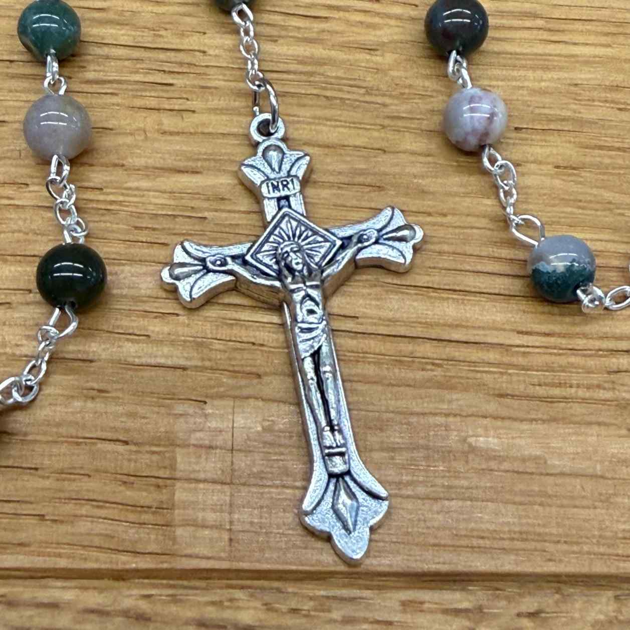 Von Hand gekettelter Edelstein Rosenkranz mit 6mm Perlen aus echtem, indischem Achat; formschönes Metallkreuz und Herzstück aus Metall.