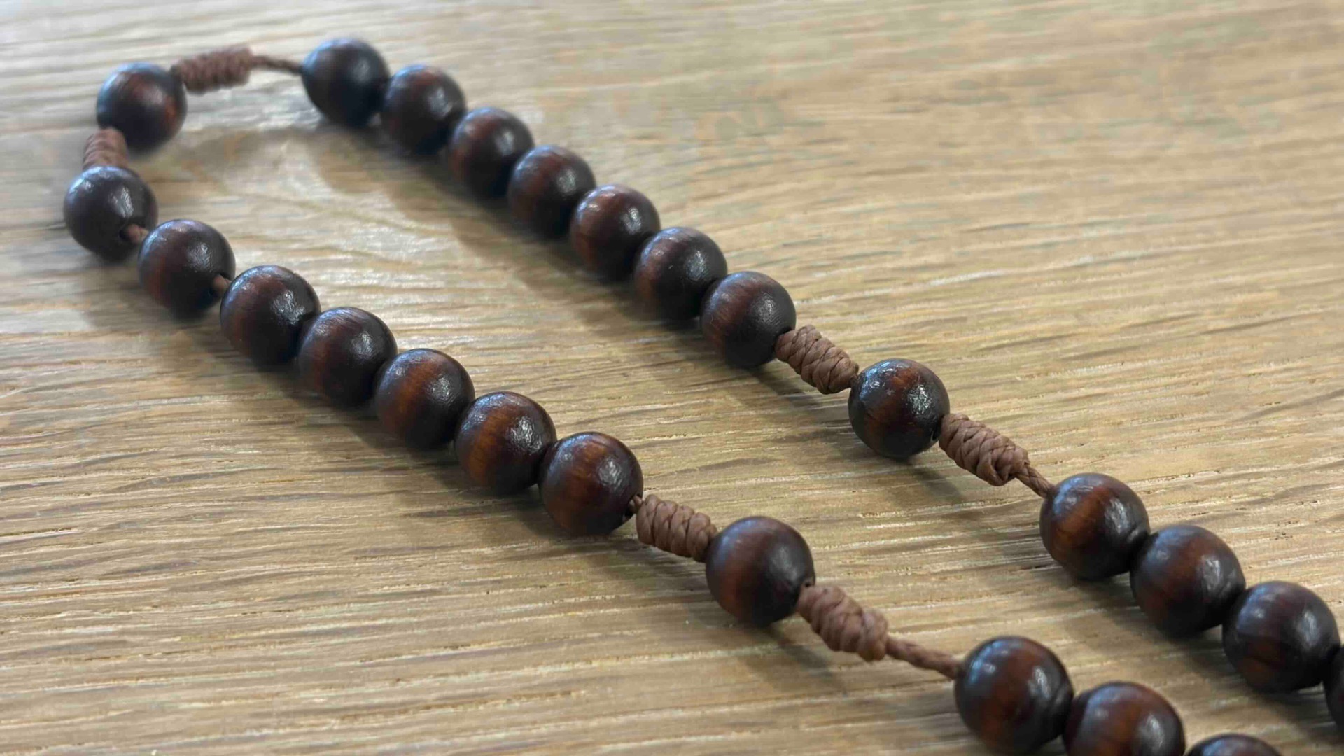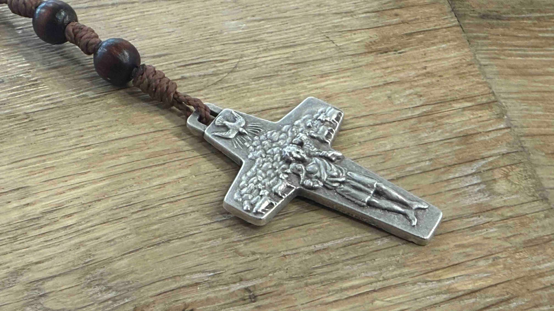 Anglikanischer Rosenkranz mit 33 x Perlen 7mm in Nussbraun, brauner Kordel und Metallkreuz mit Relief "Guter Hirte"