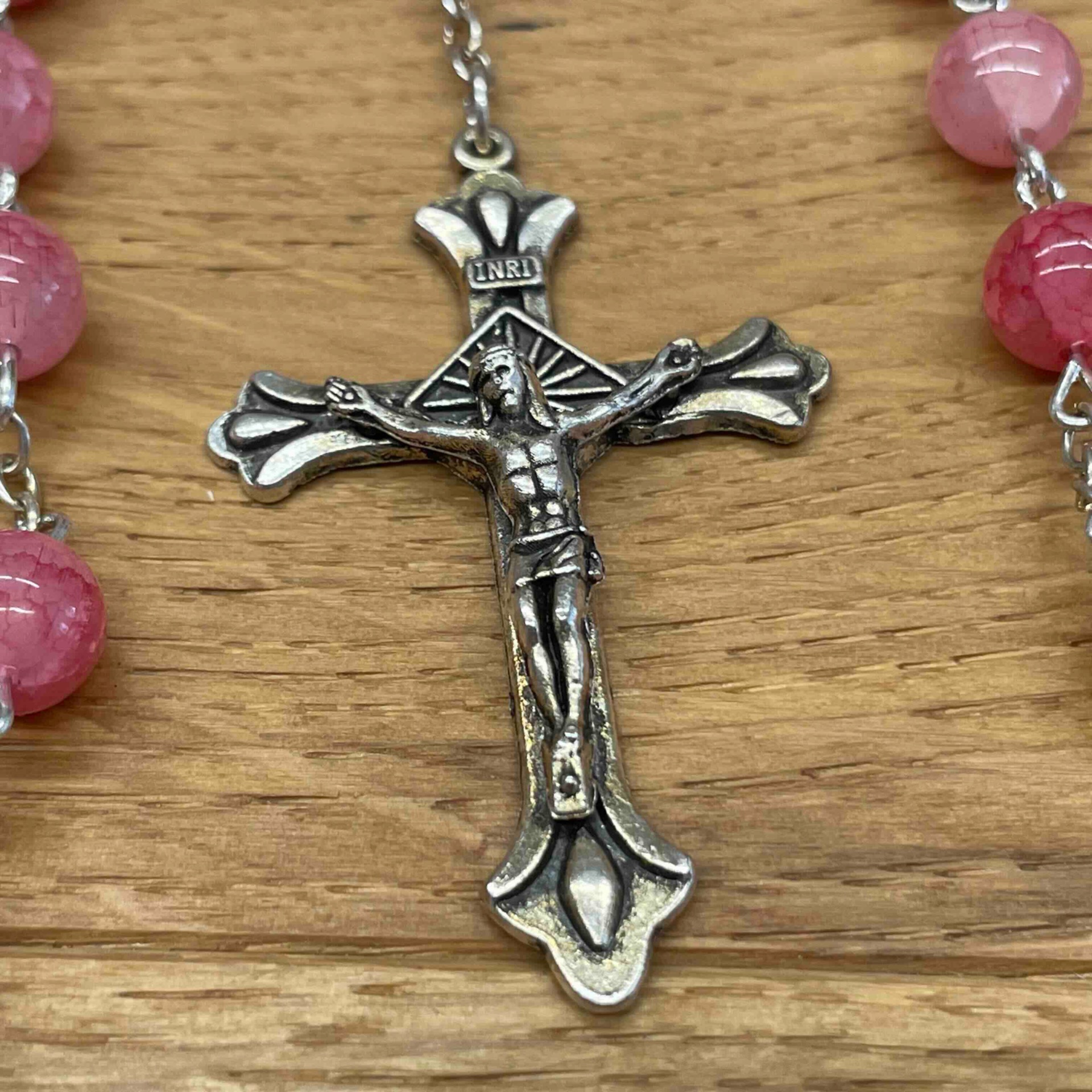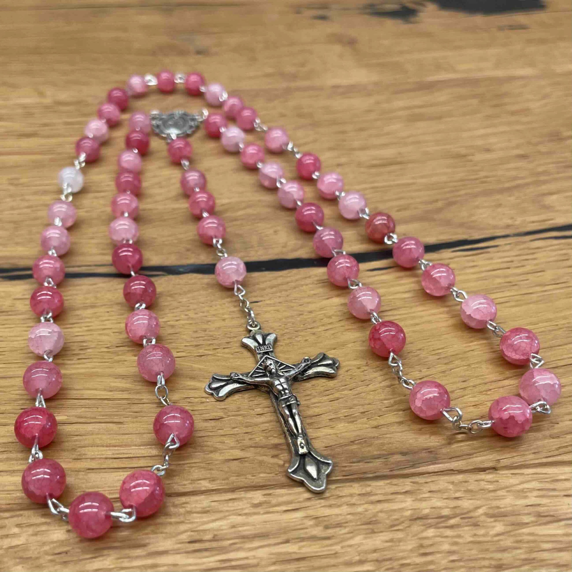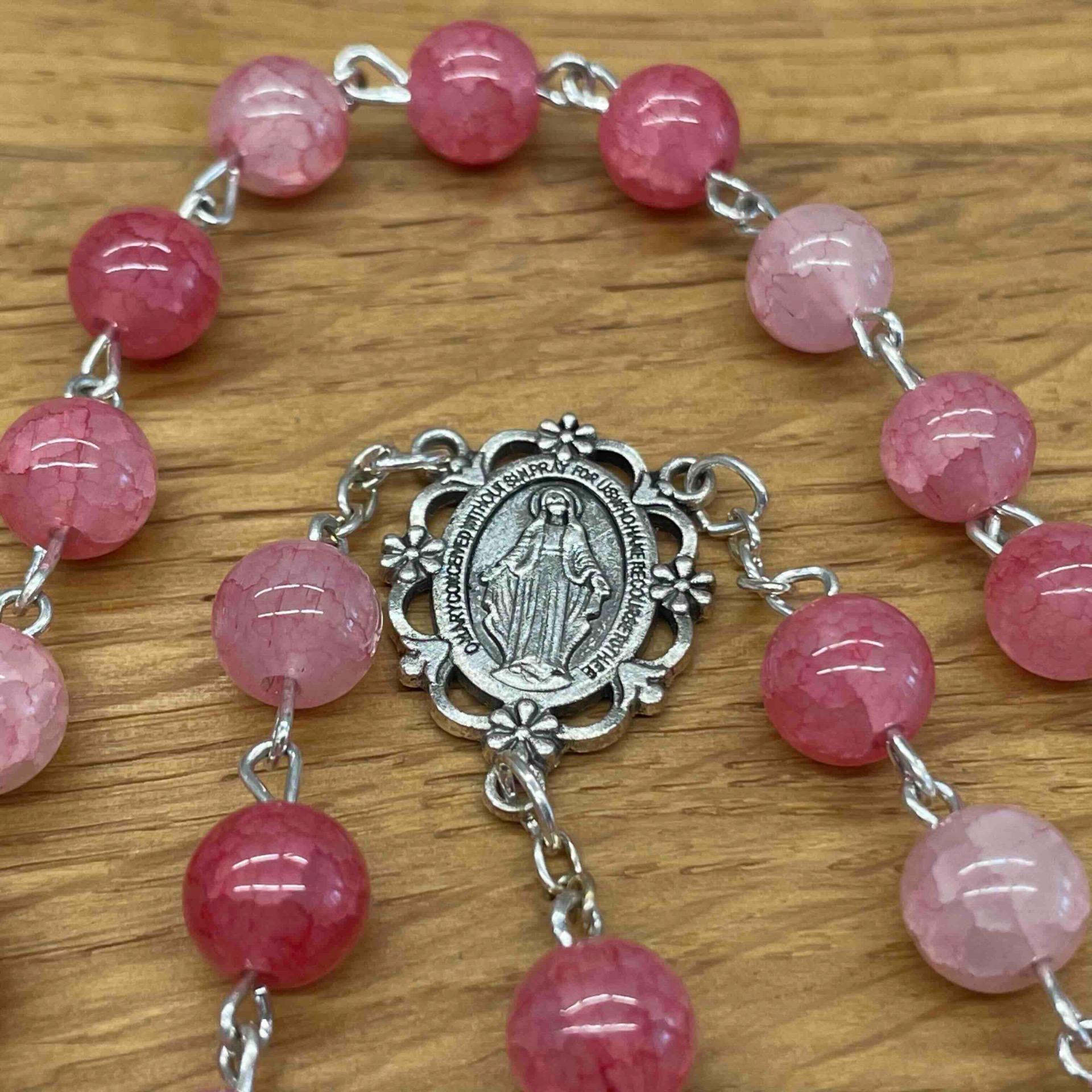Rosenkranz gekettelt mit großen 8mm Glasperlen in changierendem Rosa, Herzstück mit Relief der Wunderbaren Medaille, Kreuz aus Metall.