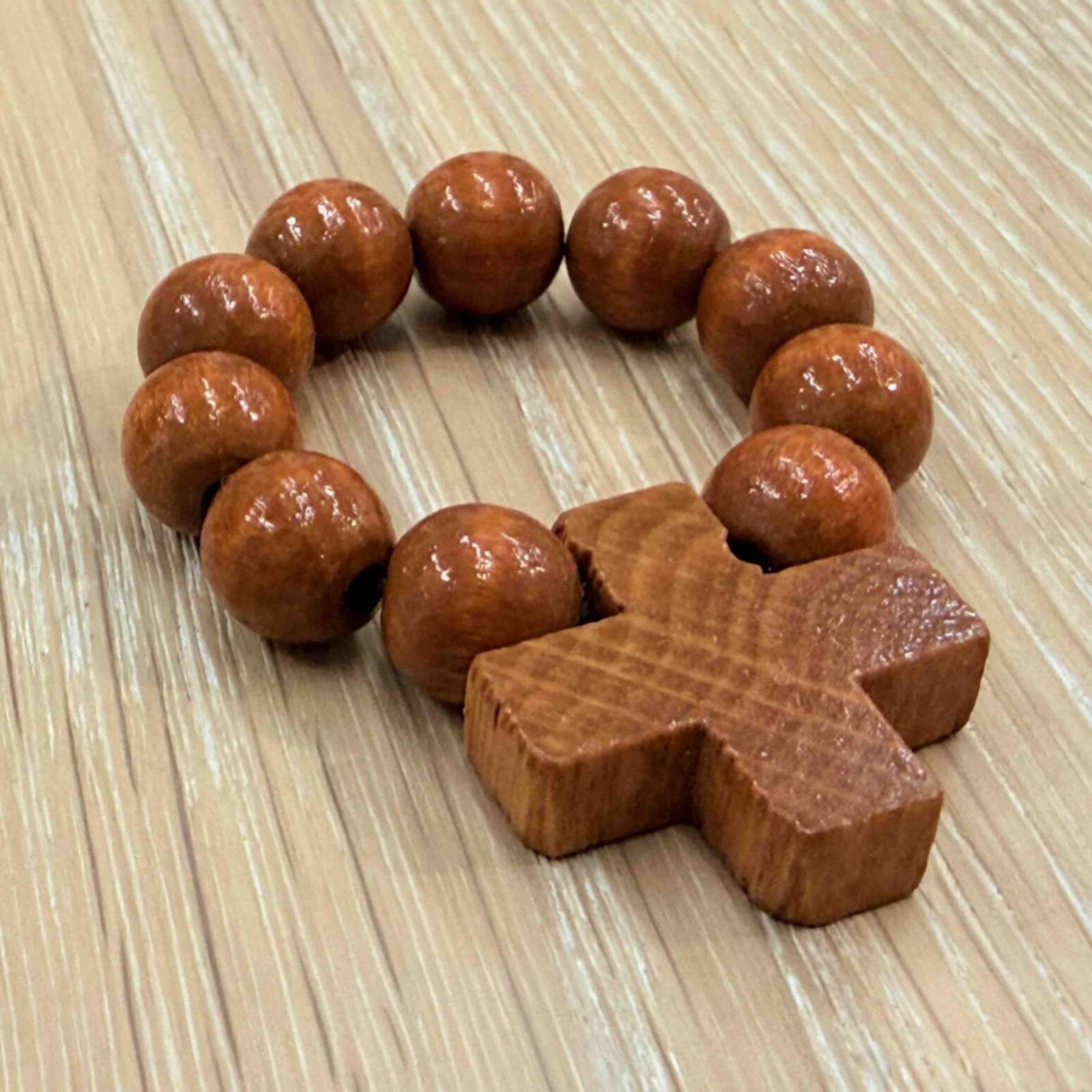 Ein schöner "Zehner" mit 1 Dekade, flexibler Bindung und herrlich-großen 8mm Holzperlen sowie schlichtem Holzkreuz 21mm. Die Bindung erfolgt nicht mit Gummischnur, sondern mit einem dauerelastischen Elastomer-PU, welches eine höhere Reißfestigkeit und Dauerelastizität aufweist. Ein wundererbarer Alltagsbegleiter, um das paulinische "Betet ohne Unterlaß" in die Tat umzusetzen. Auch als Gastgeschenk geeignet!