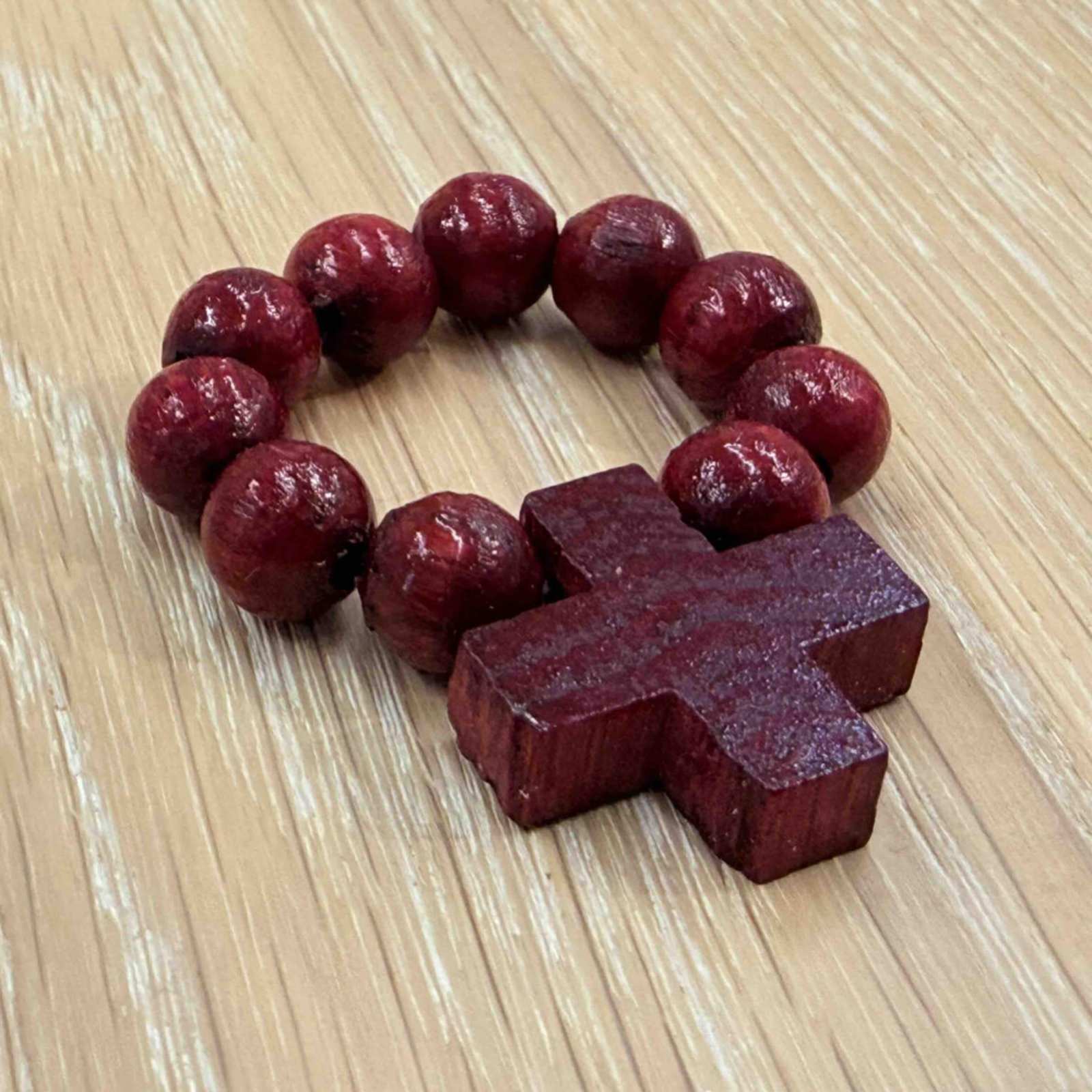 Ein schöner "Zehner" mit flexibler Bindung und herrlich-großen 8mm Holzperlen und schlichtem Holzkreuz 21mm. Die Bindung erfolgt nicht mit Gummischnur, sondern mit einem dauerelastischen Elastomer-PU, welches eine höhere Reißfestigkeit und Dauerelastizität aufweist.
