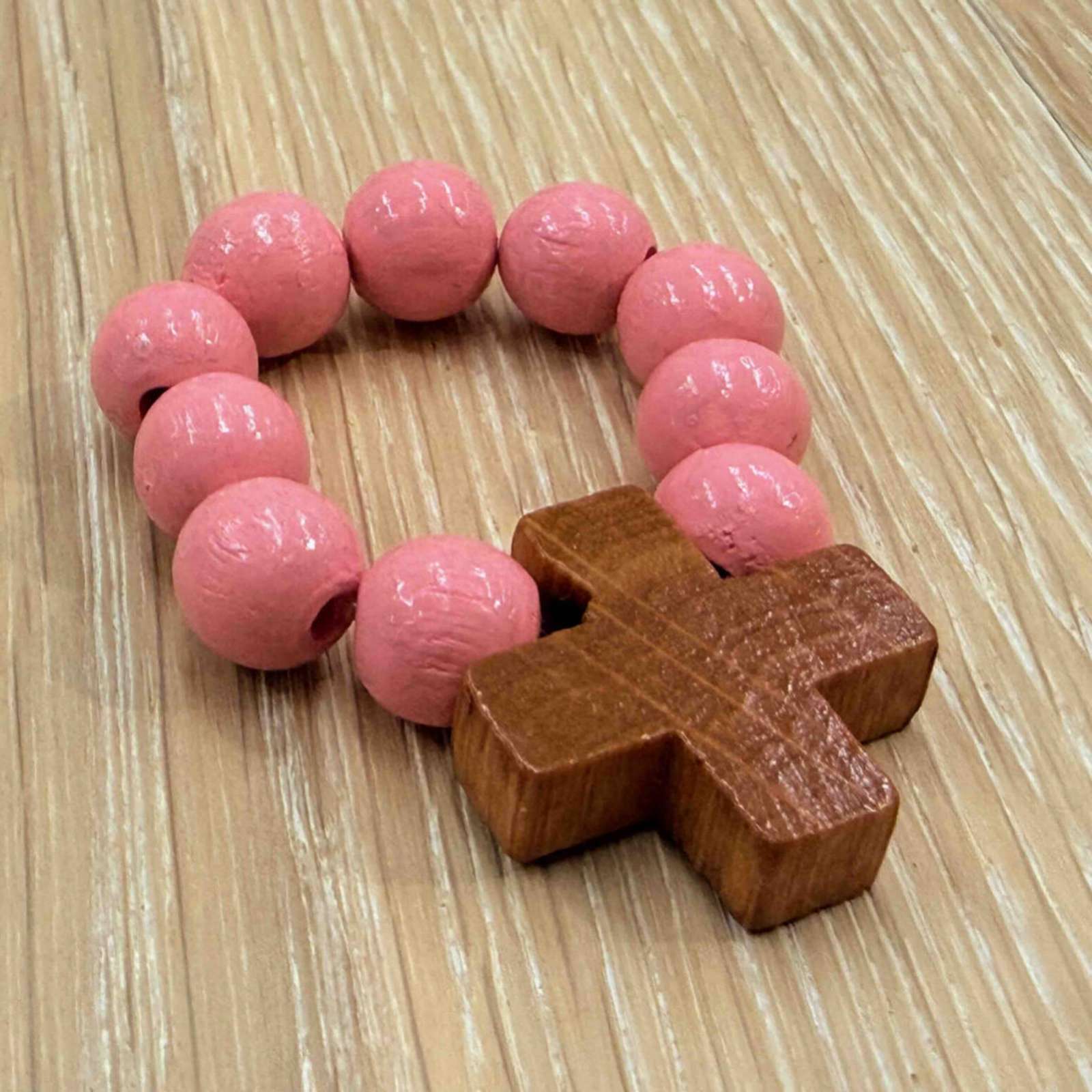 Ein schöner "Zehner" mit flexibler Bindung und herrlich-großen 8mm Holzperlen in Rosa und schlichtem Holzkreuz 21mm. Die Bindung erfolgt nicht mit Gummischnur, sondern mit einem dauerelastischen Elastomer-PU, welches eine höhere Reißfestigkeit und Dauerelastizität aufweist.